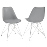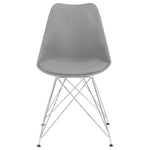 Designed with modern elegance in mind, this grey dining chair beautifully updates a contemporary home with its stylish silhouette and sleek materials. The seat and back are covered in smooth leatherette upholstery, adding a subtle textural appeal that pairs perfectly with the lightly cushioned seat for optimal comfort. The chrome-finished, metal base forms bold, angular designs, creating an eye-catching look that brings a fresh, modern vibe to any dining space. Perfect for casual meals or formal gatherings, this chair effortlessly enhances your dining room decor. Let this sophisticated piece breathe new life into your home with its chic and functional design.
