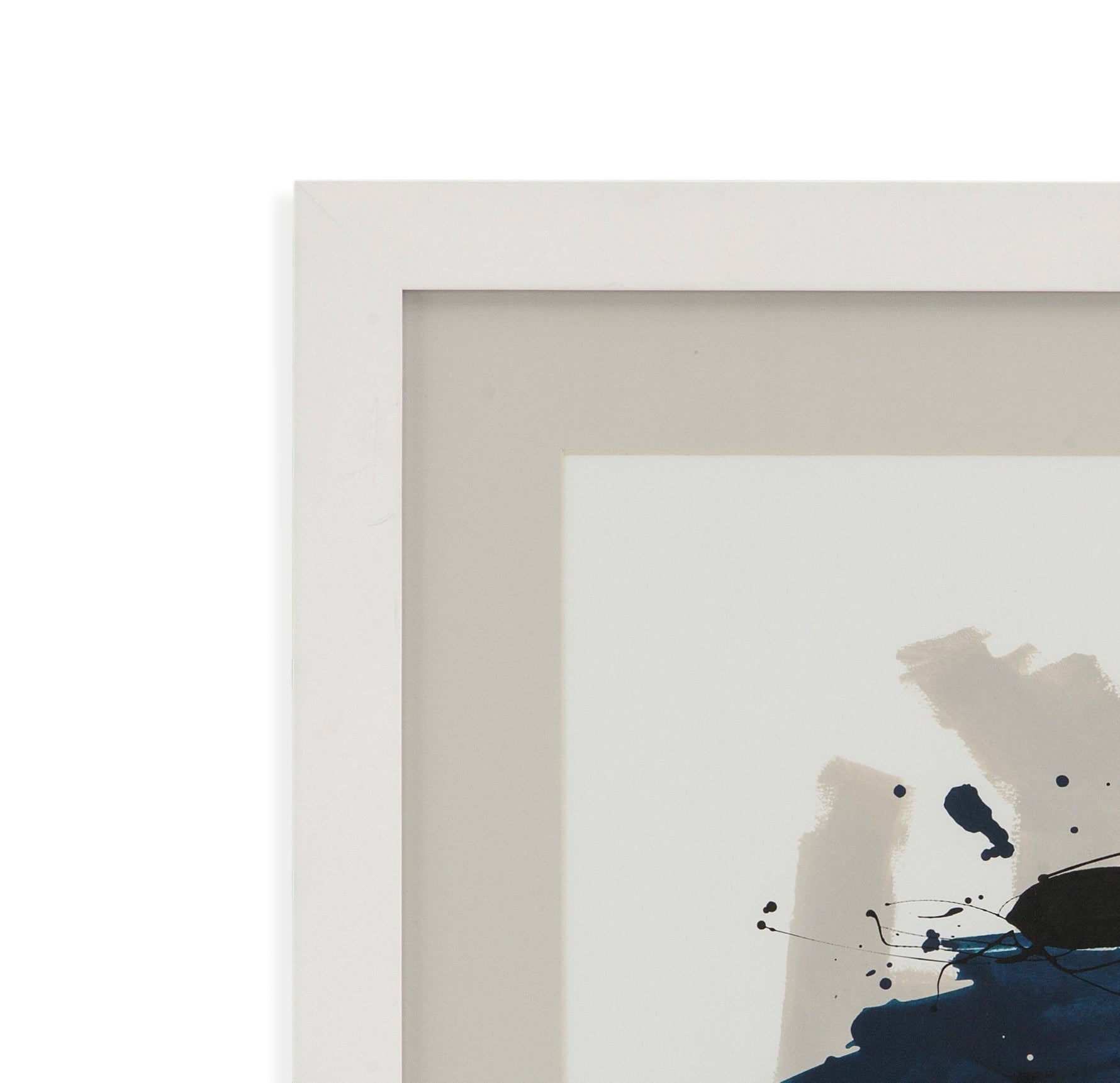 The Kanji artwork is part of a series of four, signed abstract color studies that feature taupe and black tones. The images are laser cut matted and offered with an off-white Lacquer frame.
