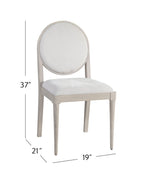 - The chair back and seat are upholstered in an off-white velvety soft fabric