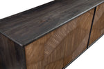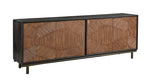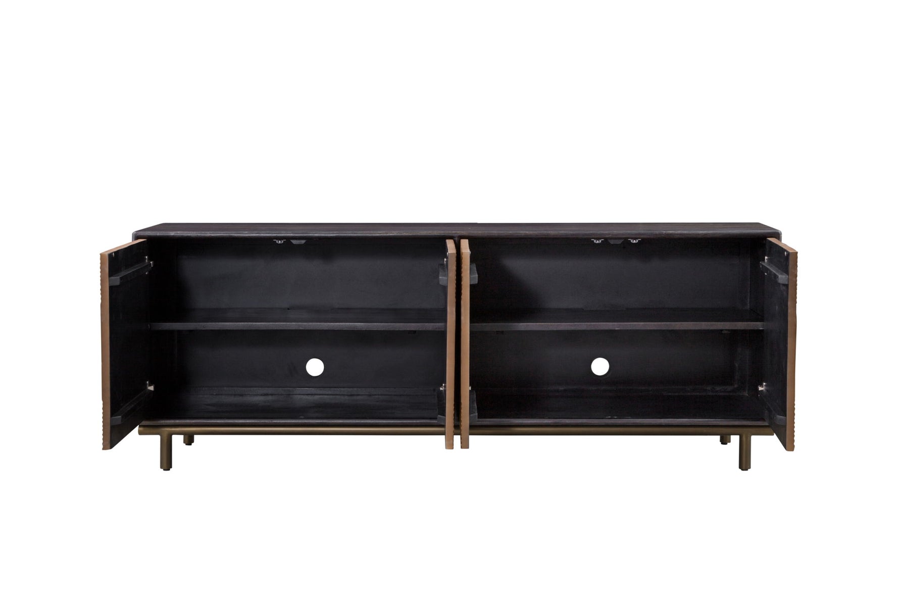 Introducing the Keir Server seamlessly blends modern aesthetics with a warm, moody color palette. Crafted from solid mango wood, its two-tone dark brown and ebonized finishes create captivating visual contrast. The dramatic iron base, finished in brushed brass, adds sophistication. Opening the doors reveals an organic-inspired geometric design, complemented by push-clasp hardware. Inside, discover functionality at its best with four adjustable shelves and thoughtful media cord management.