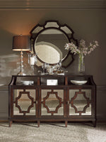 • The Elegant Top Features Three Antique Mirror Insert Panels And Faceted Corners With A Three-section Open Area Below