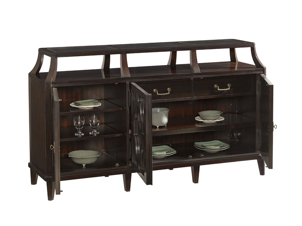 The infusion of today’s lifestyle keeps Kensington Place on-trend and relevant by allowing a new generation to make a statement of personal style. Graceful saber legs, scalloped corners and antique mirrored fronts impart a fresh look to new traditional style. Designs are crafted from Ribbon Stripe Mahogany in a rich Brentwood finish. Burnished brass pieces and plush upholstered seating pull the new-traditional look together.