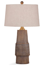 The Kingsly Table Lamp features a natural wood finish with white highlights. It is paired nicely with a beige linen tapered shade.