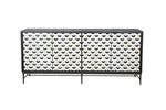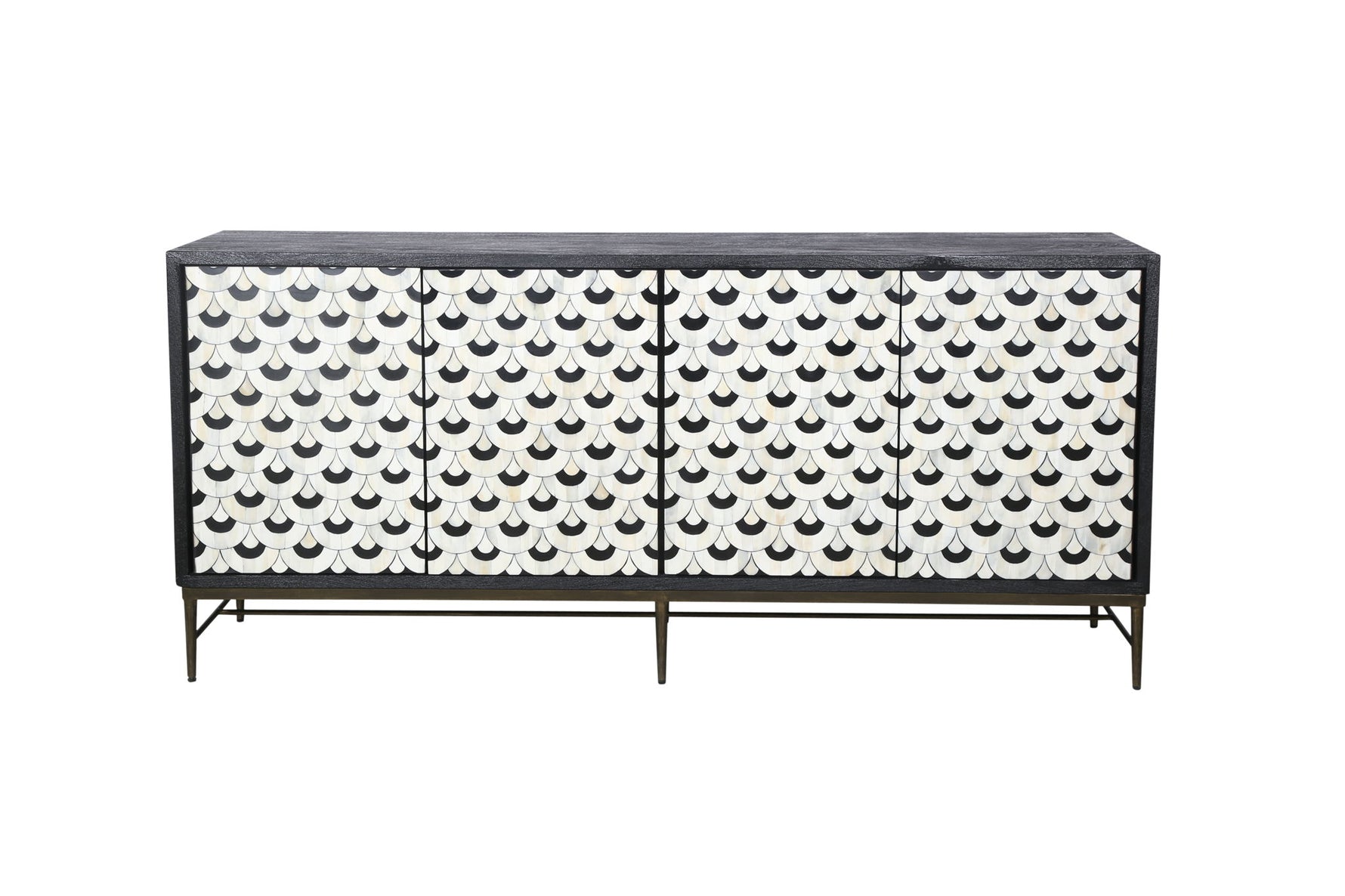 The Klaus Server offers a dramatic mix of materials and modern traditional design, making a bold statement in any room. The case frame is crafted from sandblasted solid mango in a matte ebony finish, providing a sophisticated, textured base. The doors are adorned with a scalloped pattern made of ivory and black bone and resin, creating a striking contrast that draws the eye. The iron base, with slim tapered legs and an antique gold finish, adds a touch of elegance and elevates the piece. Behind the four doors, fixed shelves and media cord management provide practical storage and organization, blending style with functionality in a beautifully crafted design.
