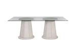 The Korey dining table is a modern mix of Boho meets Coastal design with white-washed mindi veneers. The tapered double pedestal base features box-weave cane detailing throughout. The glass table top measures 78" long and comfortably seats 6 adults.