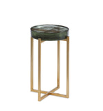 Laine Accent Table table is round featuring a cast glass top surrounded by gold finished metal base with an X motif. Finish: gold. Material: metal, cast glass. Glass casting is the method in which glass items are made by directing molten glass into a mold where it hardens. This technique has been used since the Egyptian period. In these hand-crafted pieces, you will find deeply imbedded bubbles, vailing and textures as well as some surface distortion as each piece has a unique appearance to the finished surface. This casted glass is created by a skilled artist lending itself to a unique technique and will vary slightly.