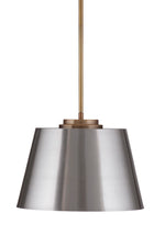 The Lancaster pendant has a modern brushed steel shade with brass details.