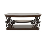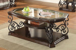 This elegant coffee table blends timeless design with practical functionality. The clear tempered glass top offers durability and a polished look, while the dark bronze powder-coated metal legs add a refined touch. A dark merlot wood finish highlights the engineered wood and cherry veneer construction. The middle shelf features a glossy wooden surface, offering additional display or storage space. Intricate scrollwork detailing enhances the classic appeal, making it a perfect centerpiece for any living room.