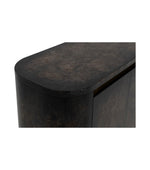 The Langford Server is expertly crafted from solid wood, showcasing beautifully selected olive-ash burl veneers finished in a rich opaque black stain that highlights the wood's natural beauty. Its clean lines and rounded end panels create a bold, modern statement. Behind the four doors, you'll find adjustable shelves for versatile storage and convenient media cord management. This piece seamlessly combines style with functionality, making it a perfect addition to any dining or entertainment space. Elevate your decor with the sophisticated design of the Langford Server.