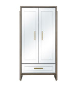 The Lansing Tall Bar Cabinet exudes modern-glam elegance with its cerused grey oak case and sleek mirrored doors, highlighted by brushed gold bar-pull hardware. Inside, an illuminated mirrored back panel adds sophistication, while dedicated storage for stemware and bottles ensures functionality. An additional drawer provides extra convenience, making this bar cabinet a stylish and practical addition to any entertaining space.