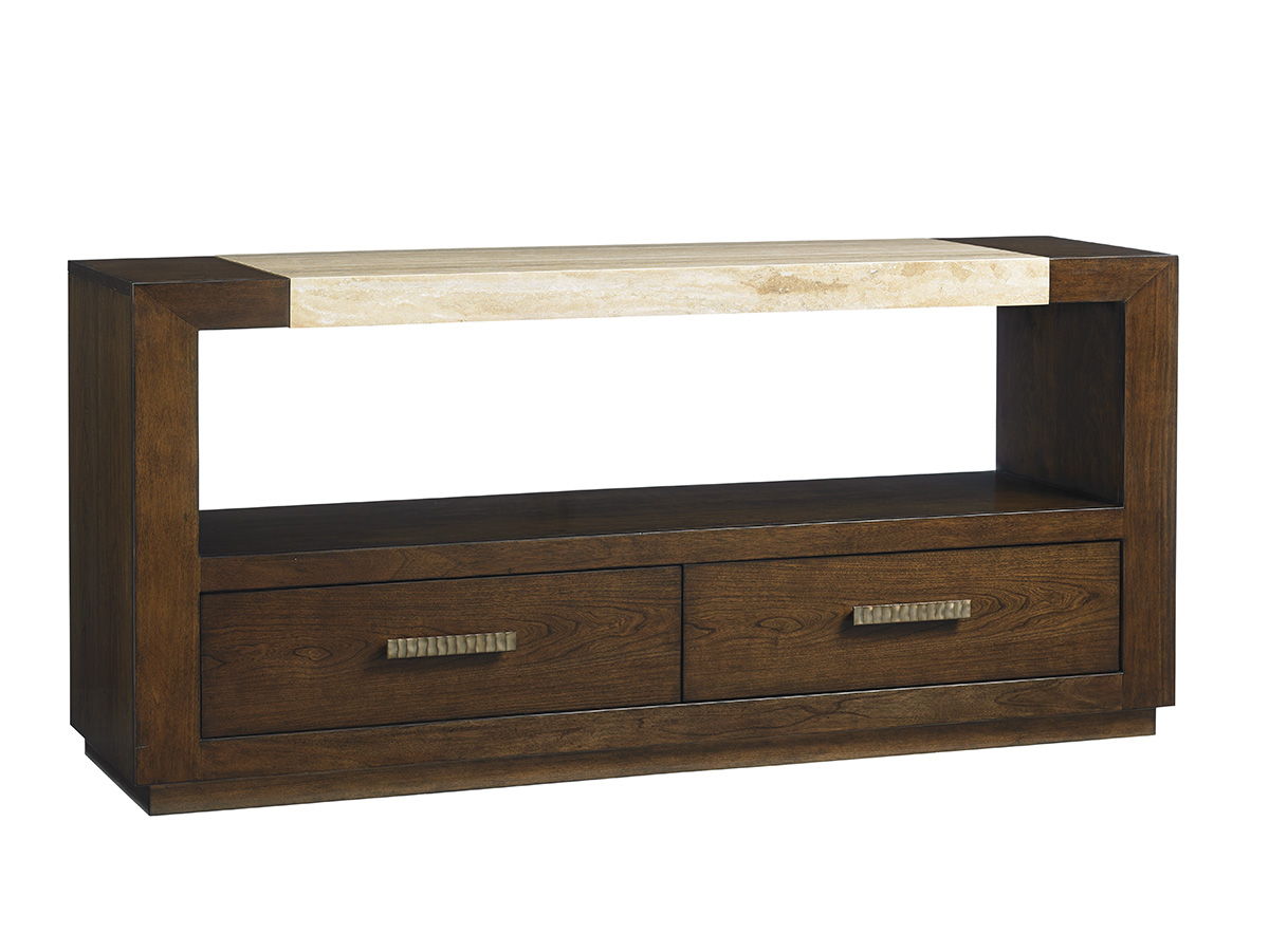 • An Inset Silver Travertine Top Is Artfully Suspended Above An Open Compartment And Two Full Extension Drawers