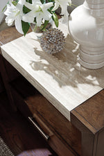 - A Single Drawer Provides Ample Storage While The Open Compartment Provides An Attractive Display Area, Enhanced By Touch Lighting Easily Accessible Under The Front Center Of The Travertine