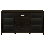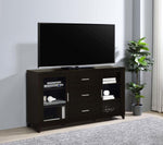 This handsome TV console is the perfect blend of convenience and class. Its large, sturdy surface provides plenty of space to accommodate televisions of all sizes. Its durable, wooden shelves are easily adjustable for added versatility. Three spacious drawers in the center offer plenty of room to store games, movies, and more. Its stately silhouette is enhanced by tapered legs and brushed silver hardware, while an elegant cappuccino finish completes its striking look.