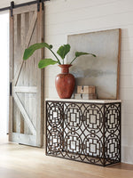 - A Native American Design On The Metal Base Is Paired With A Veneered Travertine Top, Making A Great Statement In The Entry, Living Room Or Dining Room.