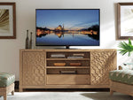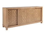 • The 79-inch Media Console Features An Intriguing Tribal Design In The Fretwork Of The Four Sliding Bypass Doors