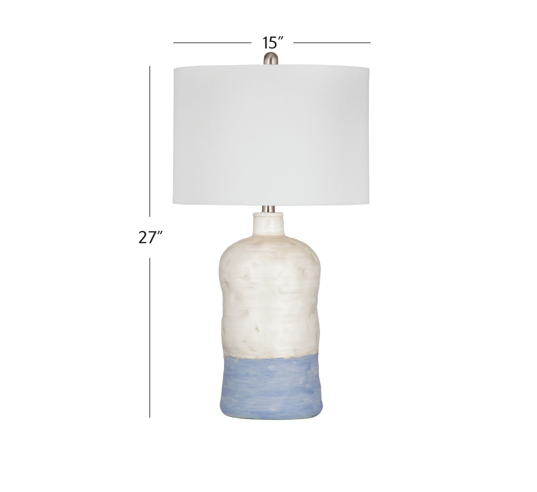 The Lucy Table Lamp is crafted of resin with a white drum shade. Features a coastal style with the organic shape and light blue and white color palate. Required type A bulb that is not included. Features a 3 way turn knob light switch and up to 100 watts.