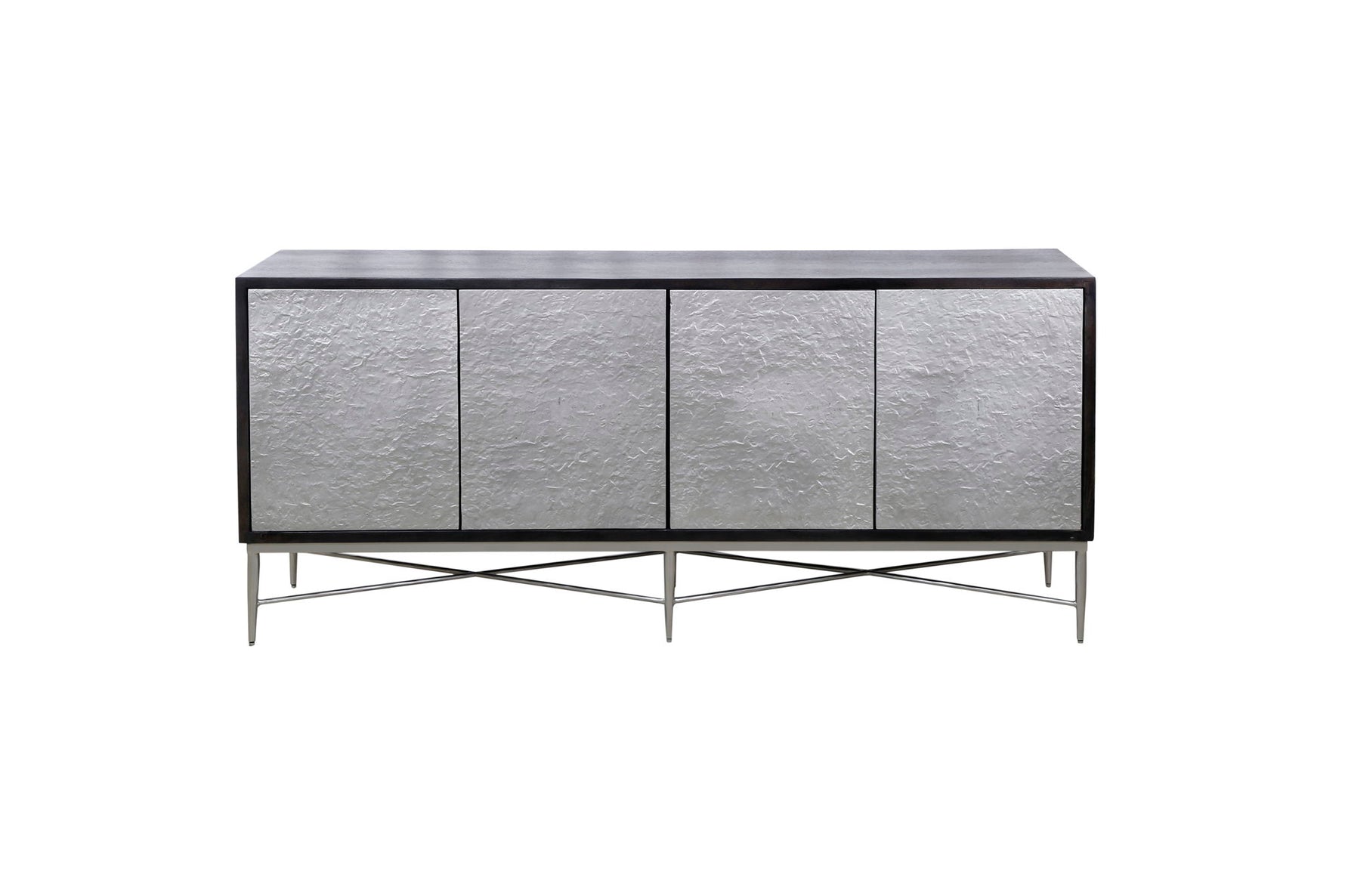 The Lumina Server seamlessly blends contemporary and modern elements for a stylish addition to any space. Crafted from solid mango wood with an ebonized finish, it features textured cast-aluminum doors adorned with a sleek nickel finish. The server rests on an iron base with slim tapered legs, also in a nickel finish, adding to its modern aesthetic. Inside, fixed shelving offers ample storage with convenient media cable management. As mango wood is a natural material, each piece boasts unique variations in color, density, grain, and finishing, while the cast aluminum doors undergo manual processing, resulting in distinct textures and colors. With its contemporary design, luxe materials, and mix of textures, the Lumina Server brings a touch of sophistication to any room.