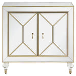 This glamorous accent cabinet lends an air of sophistication and elegance with its polished mirror surfaces and champagne accents. With an inverted beveled design along each of the dual cabinet doors, outlined by a champagne trim, this contemporary accent cabinet lends a stunning addition to any space. Reflecting the champagne elements are teardrop shaped pendant hardware and champagne caps at the tips of turned acrylic feet. Behind the cabinet doors are two shelves where you can store anything from clothing to books and office supplies. As functional as it is gorgeous, this accent cabinet is for homes of a refined taste.