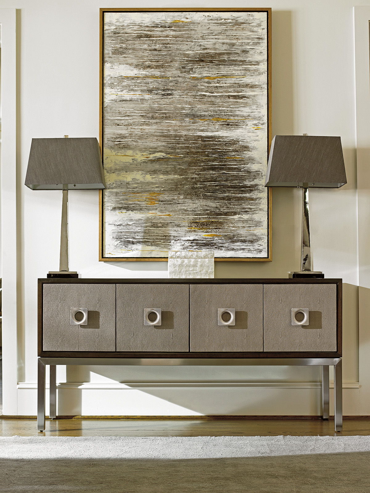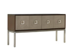 - The Serving Surface Is Quartered Walnut, Yet The Eye Is Drawn To The Four Taupe Colored Faux Shagreen Doors Accented By Dramatic Hardware
