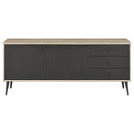 Light, airy energy and minimalist Scandi design combine to create a chic storage solution for any room. A modern accent cabinet features a pine wood finish case that's cool and neutral, perfect for a living or dining room. Door and drawer fronts add a contrasting antique gray finish that's rich and elegant, offering contrasting color and style for a stand-out look. Two doors open to reveal two shelves, great for everything from dinnerware to clothing and accessories. Three drawers create the perfect spot for smaller items, adding organization in an entry or home office.