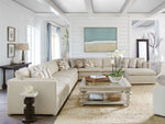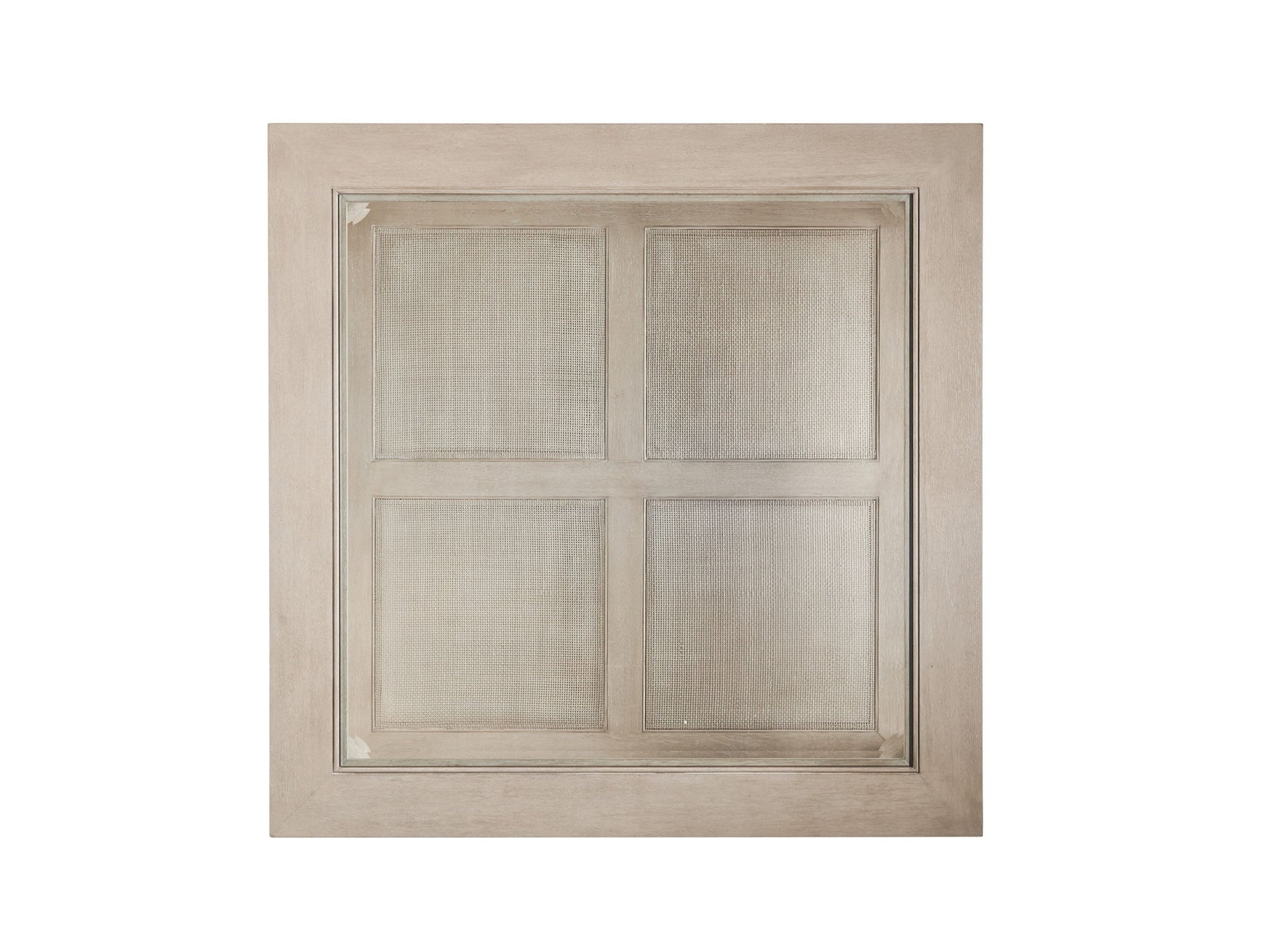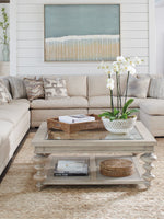 The Castlerock cocktail table offers a neo-traditional look, with turned legs, a beveled glass top and woven cane shelf at the base.The 48-inch square design is scaled to work beautifully with the Colony sofa or sectional