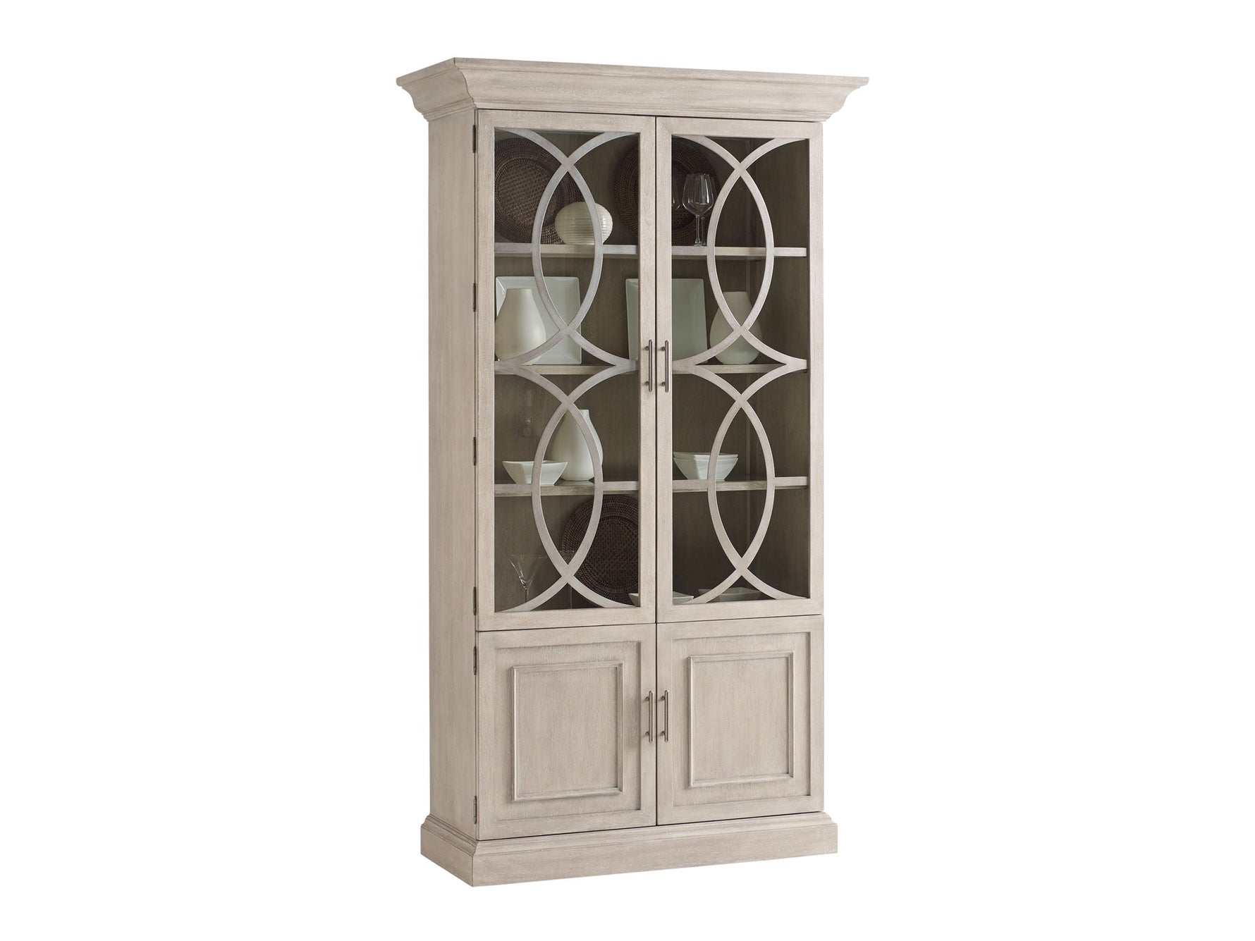 - The El Matador Curio Features An Elegant Concentric Circle Design Of Metal Fretwork On The Glass Doors, Three Wood-framed Adjustable Glass Shelves And Led Touch Lighting