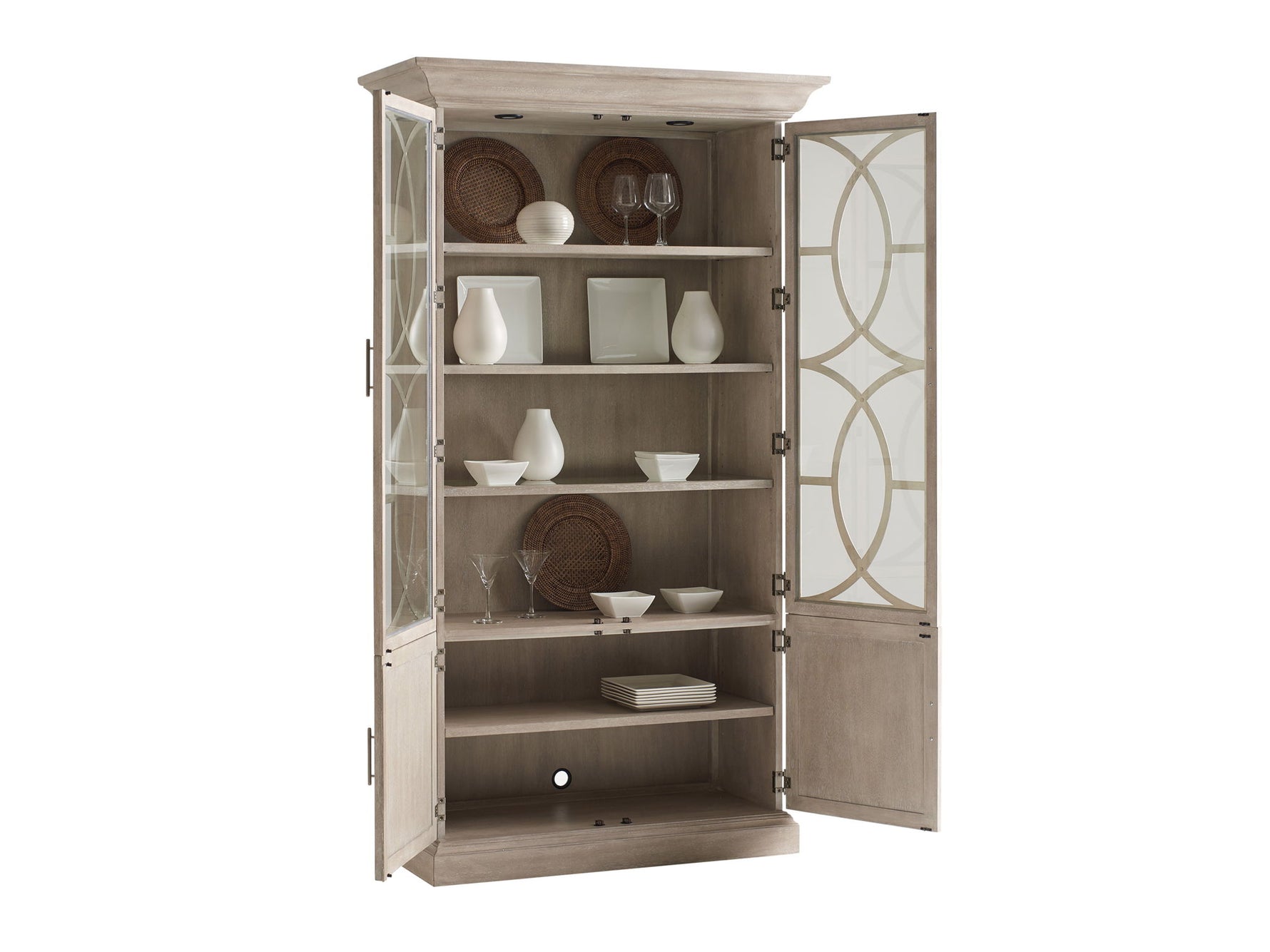Unit price perThe El Matador curio features an elegant concentric circle design of metal fretwork on the glass doors, three wood-framed adjustable glass shelves and LED touch lighting