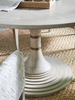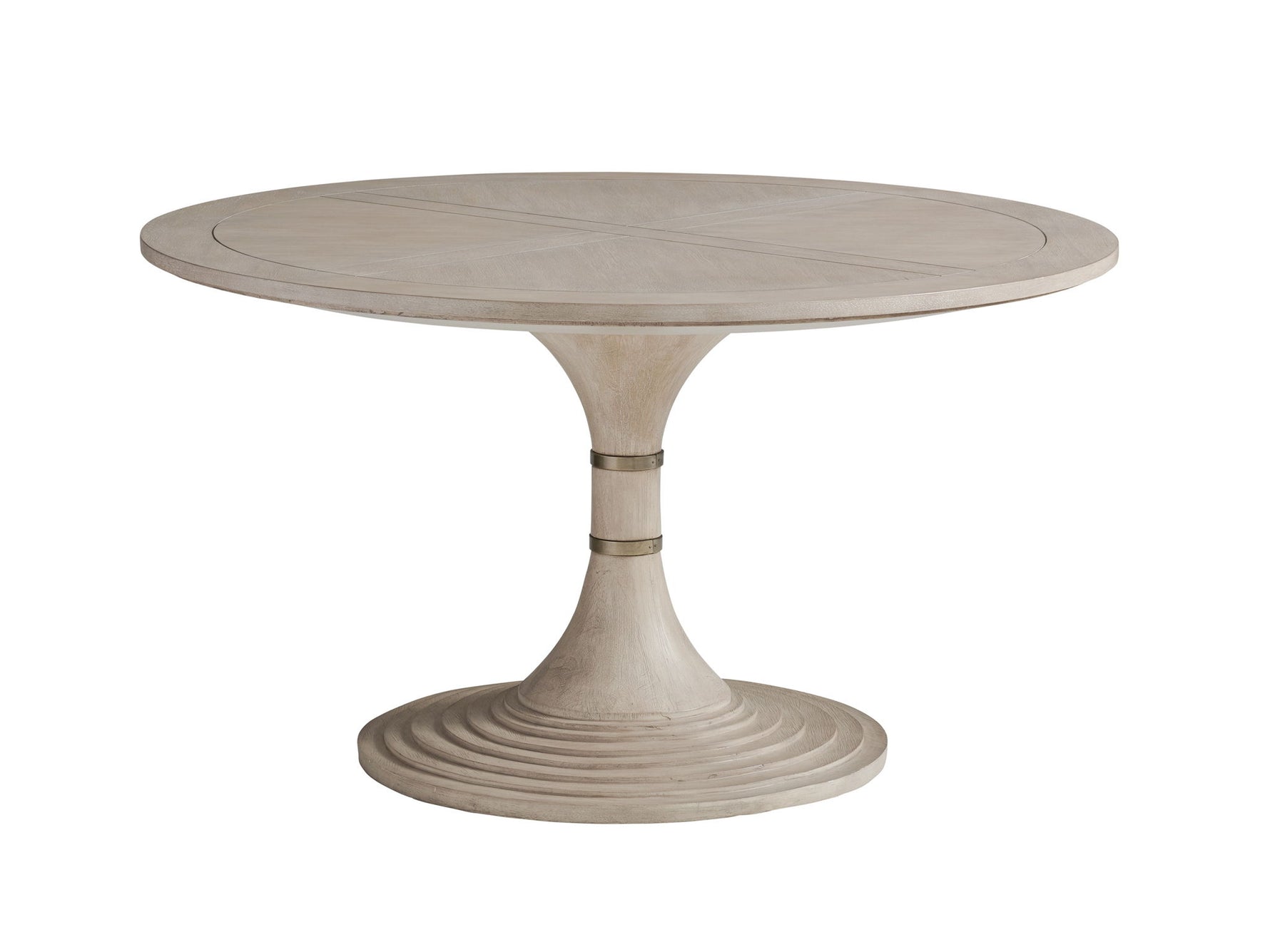 Unit price perThe 54-inch dining table features an elegant hour-glass design, with two decorative metal collars on the pedestal and a contemporary waterfall detail on the base