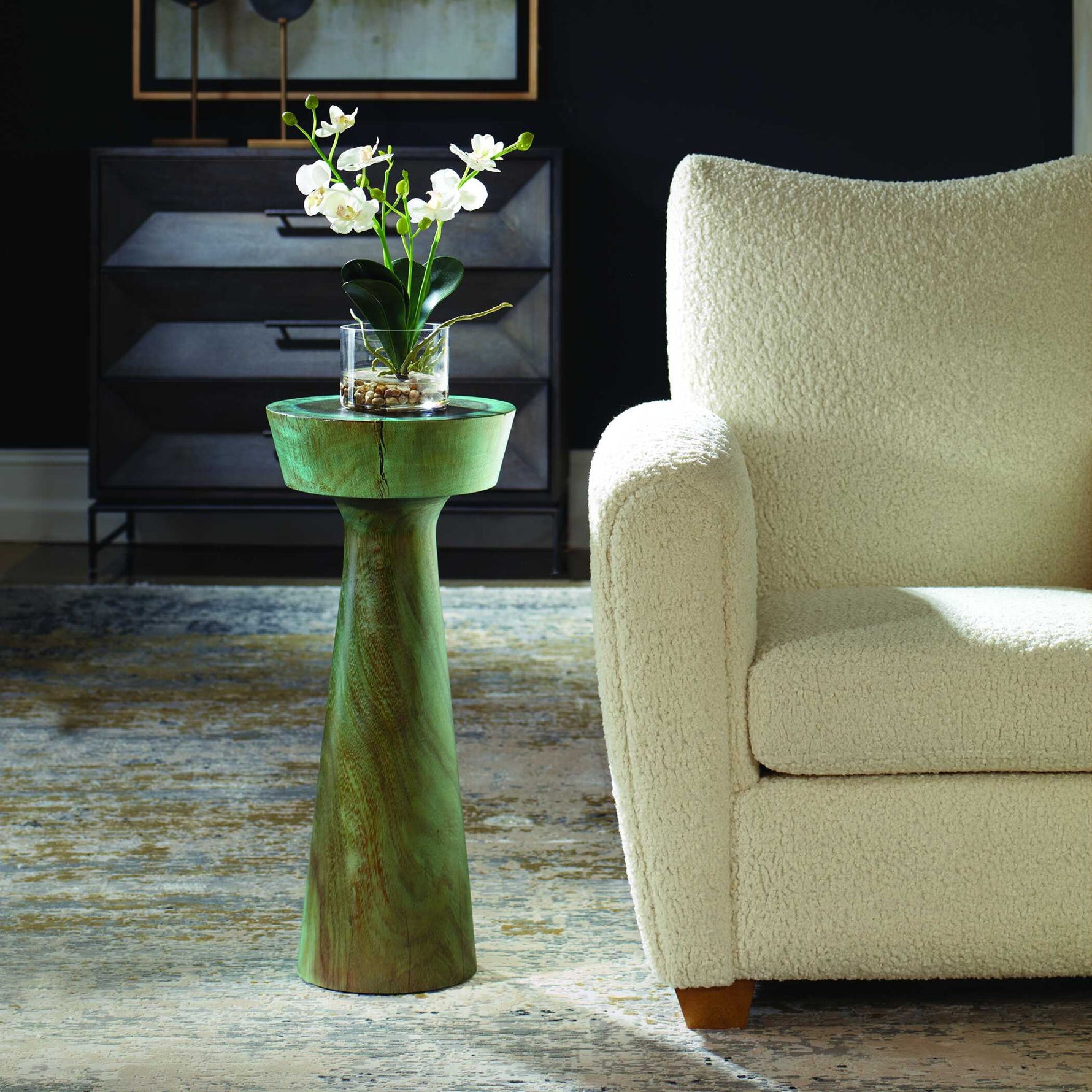 - Crafted From Solid Suar Wood, This Drink Table Features A Striking Blend Of Blue And Green Tones That Enhance Its Natural Grain And Organic Form. The Tabletop Sits Atop A Tapered Pedestal Base.