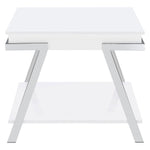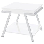 Go full-on modern with a casual feel that delivers a surprising energetic boost. This ultra-contemporary end table made of white high gloss finish MDF with paper coating creates a stir in your laid-back living room or family room. Angular metal framing adds a fresh aesthetic boost. A modular-like configuration works well in today’s trending spaces as this end table increases storage and display space with a lower shelf. Seek a seamless contemporary attitude with this stylish end table.