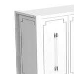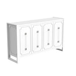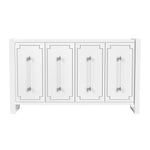 The Mariah Server embodies a touch of glamour with its sleek, pearlized white finish. Its four doors showcase intricate silver overlays and are elegantly accented by long acrylic bar pulls with silver caps. When you open the doors, you'll find two cabinet spaces in each, each equipped with an adjustable shelf and media cord management. This server seamlessly combines style and functionality to enhance your living space.
