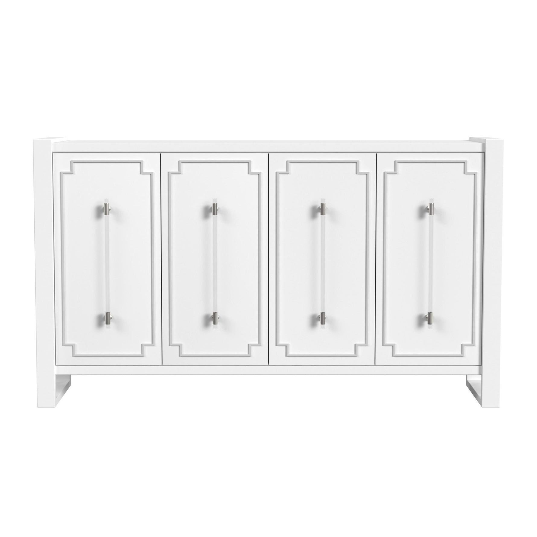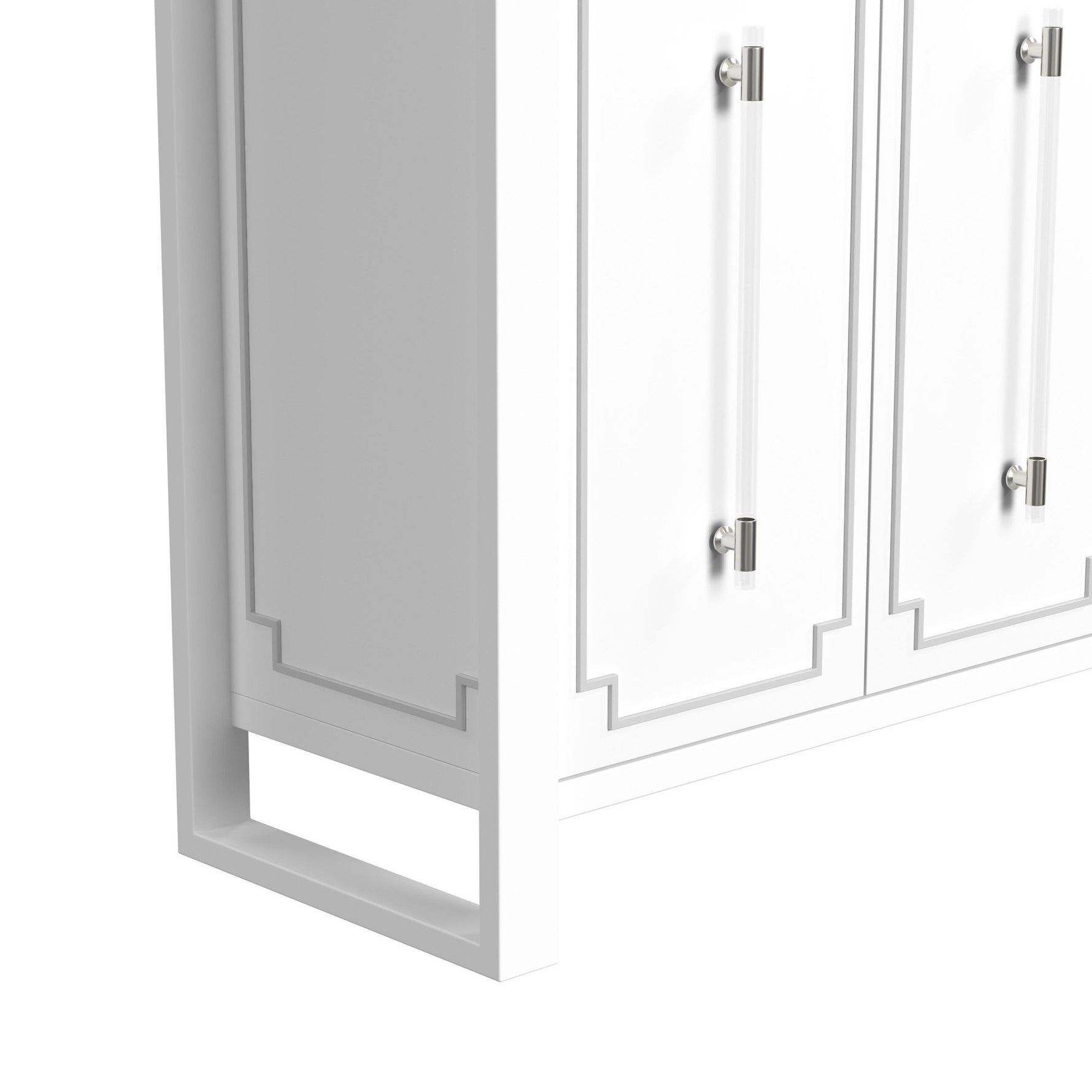 - Its four doors feature intricate silver overlays and are adorned with long acrylic bar pulls, complete with silver caps