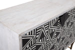 - Crafted with precision, its exterior features an appealing whitewash finish and striking geometric patterns on the cabinet doors, achieved through the artful use of bone and resin inlays
