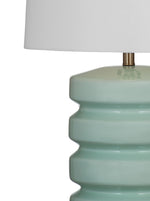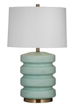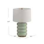 The Marzz Table Lamp is crafted of ceramic and metal and features a drum shade. Finished in light green and antique brass. Features include a 3 way switch.