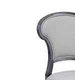 - The upholstered dining chair seat and back feature gray rub-through style fabric