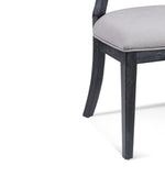 The Mateo Dining Chair features transitional styling. Features a curved seat back with tapered front legs and tapered flared back legs. The wood frame is finished in black oak veneer, complementing the gray rub-through style upholstered fabric on the seat and back. Features also include drive in floor glides on the leg bottom and a high density foam seat cushion. Seat Dimensions: 20.5"W x 18"D x 18"H.