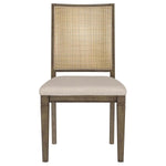 A trio of natural hues brings refined but casual character to a modern farmhouse dining chair. Perfect for friends and family enjoying delicious meals, the chair features a plush foam seat with beige upholstery. Its back is rattan, adding texture and character while maintaining a light, airy look and feel that's rich and breathable. Its classic stance features an armless silhouette complete with a gently angled back and straight, tapering legs. The natural finish of the wood offers a refined but accessible look, perfect for inviting family spaces.
