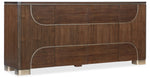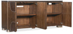 Unit price perA dark walnut finish with a contrasting veneer pattern is accented with champagne trim and feet on the Mélange Contours Credenza. Crafted of Walnut Veneer in a Dark Walnut finish, the credenza has four touch latch doors with soft close hinges and one adjustable wood shelf behind each pair of doors. There’s a ventilated back panel and wire management behind each pair of doors, making this piece media-friendly.