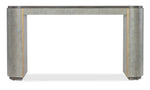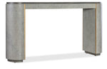 With the design flair of a luxurious fashion accessory, the Dylian Console Table has a gray crocodile exterior with gold metal accents and a dark wood top and base. Crafted of Pine Veneers and Robus Leather, it has an oval shape and measures 64 inches wide by 16 inches deep.