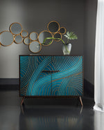 Unit price perExciting and elegant, the Esperanza Two-Door Chest is inspired by Mid-Century Modern forms, updated with a vibrant 21st Century color palette. Raised gesso teal paint is accented with gesso gold paint in a swirled pattern for tactile beauty. Crafted of Walnut Veneers with rattan, the Esperanza has one adjustable wood shelf behind each door. Back panel is the same color as the top and sides. Come closer to Melange, and you will discover something unexpected, an eclectic blending of colors, textures and materials in a vibrant collection of one-of-a-kind artistic pieces.