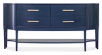 Unit price perA classic credenza silhouette gets a refreshing update in the Mazarine, featuring a serpentine-shaped front, rich dark blue finish over Cherry Veneers and fluted tapered legs. The modern pewter-colored stacked bar pulls add a contemporary flair. One fixed shelf and four self-closing drawers.