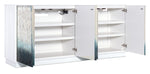 Unit price perWith the allure of an impressionistic painting, the Mediterranean Entertainment Credenza has four white and blue ombre-colored textured door fronts. The interior and case of the credenza is in a soft white. There are two adjustable shelves behind each pair of doors and a 3-plug outlet behind the left pair of doors in the upper right corner. Crafted of Pine and Maple Veneers, the credenza accommodates up to a 75-inch TV.