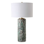 This Table Lamp Is Inspired By Abstract Forms, Featuring A Ceramic Base That Boasts A Heavily Textured Ivory And Teal Glaze, Set Against A Dramatic Charcoal Background. Brass Plated Details Add A Touch Of Sophistication To This Striking Piece. The Round Hardback Drum Shade Is A Crisp White Linen Fabric.