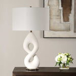 The Meridian Table Lamp Features A Unique Infinity Shape That Adds A Modern Flair To Classic Design. Its Rich Ivory Man-made Stone That Accurately Replicates The Look Of Thassos Marble Is Complemented By A Plated Antique Brass Foot And Matching Hardware. The Lamp Is Paired With A Hardback Drum Shade Covered In A White Linen Fabric.