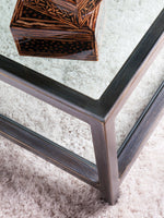 Tubular steel frame, glass top with flat polished edges, and inset glass shelf