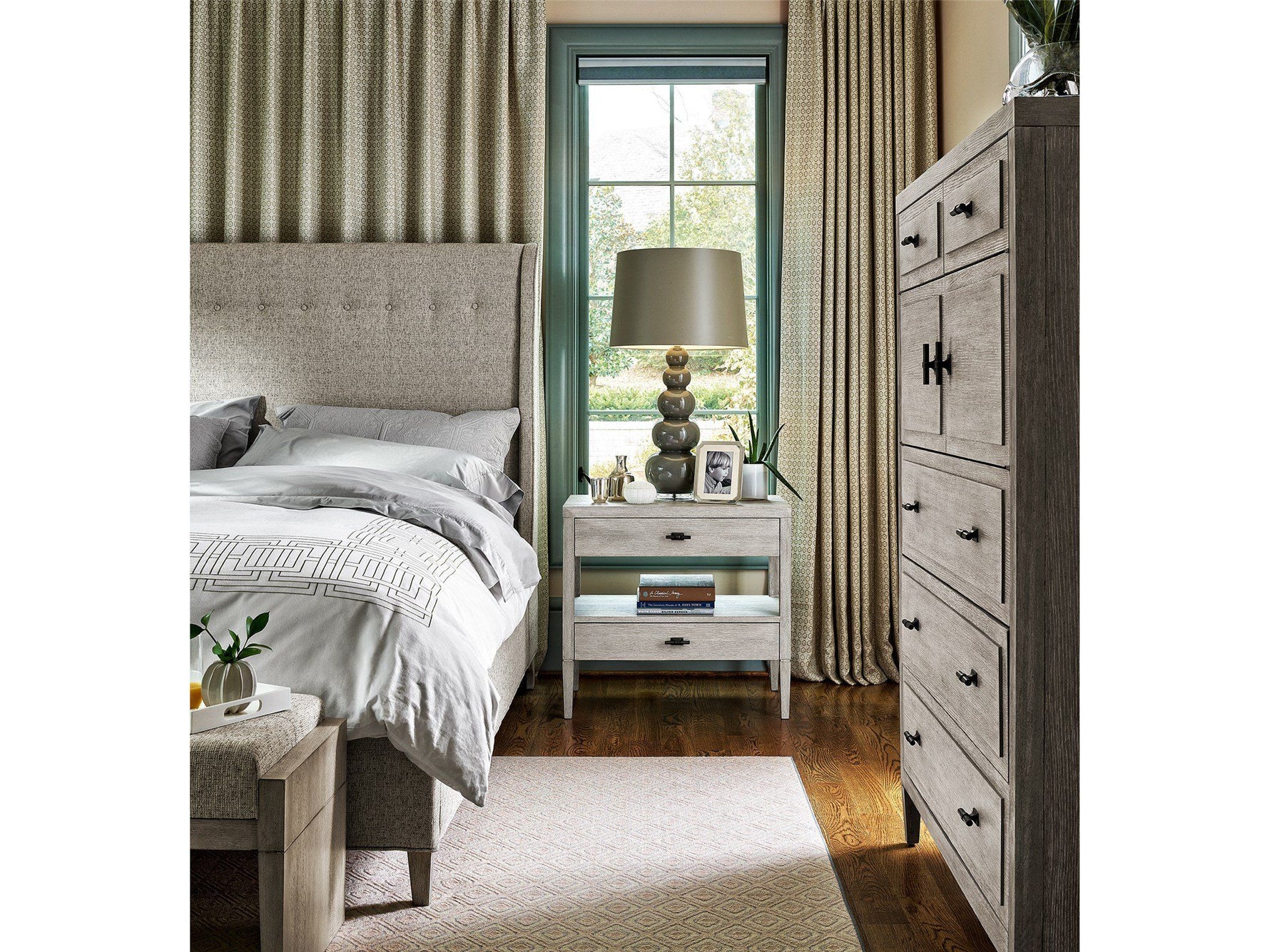 Unit price perBuilt with an open display area and two spacious drawers, the Midtown Nightstand is defined by a regal Flannel finish and is accentuated by two Dark Pewter bar hardware pulls.
