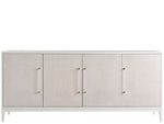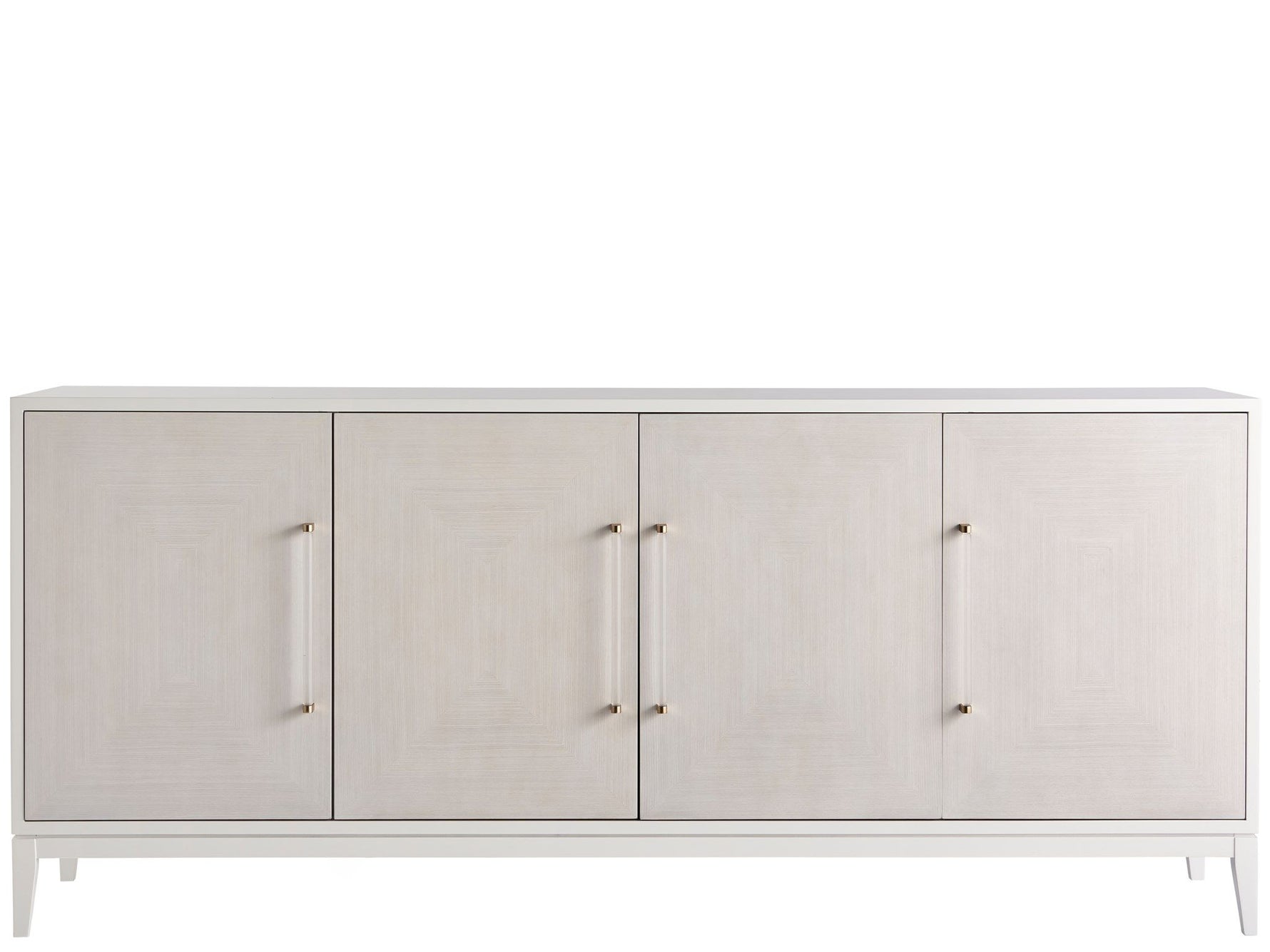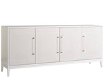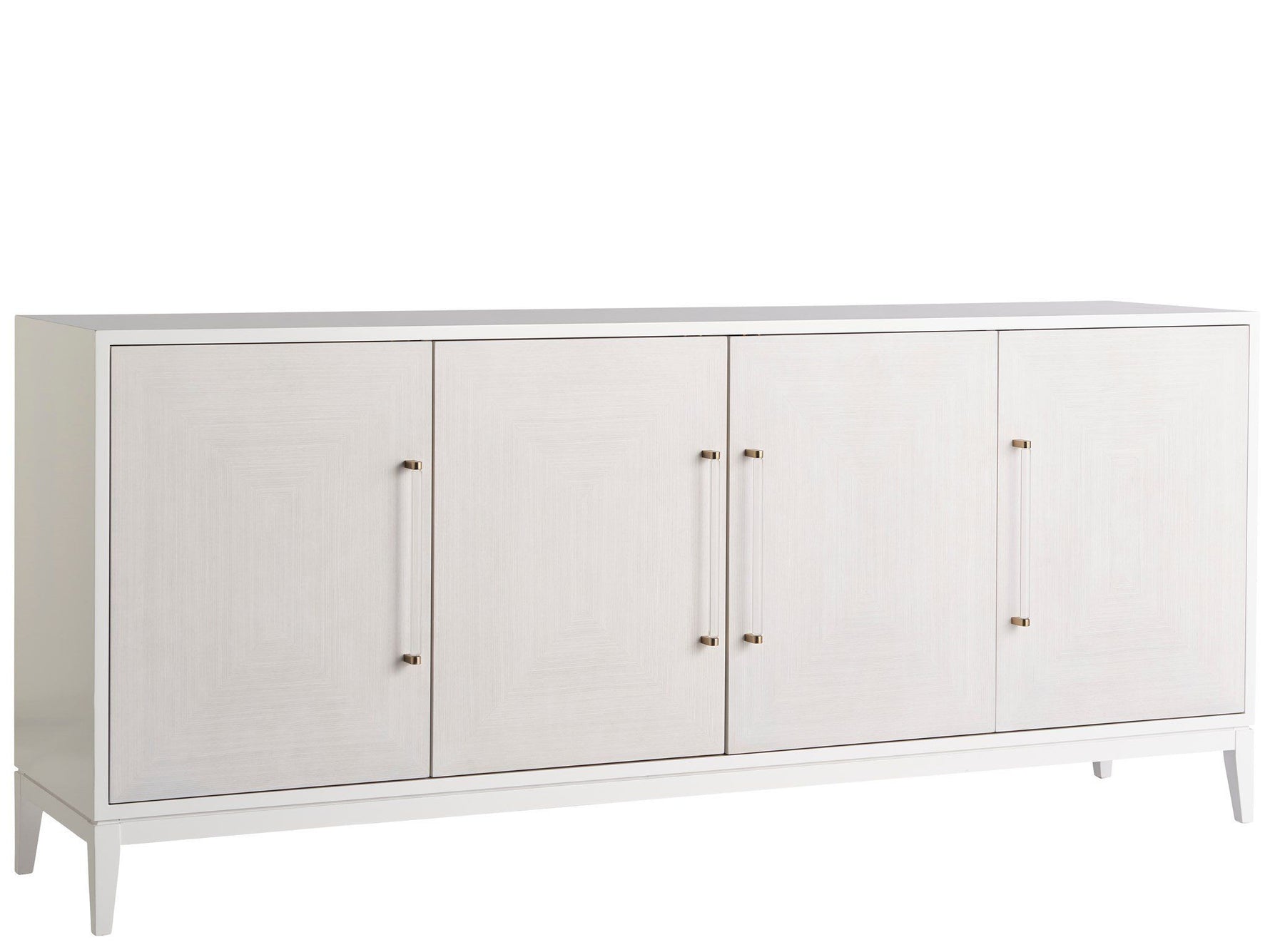 Practical yet graceful, the Desert Rose Sideboard features four doors in an Alabaster finish with acrylic and champagne bar hardware, one tray drawer and adjustable wooden shelving within a sleek white lacquer case.