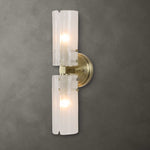 Two Handmade Glass Panels Of Etched Translucent Seeded Glass Complete Each Shade Of This Opulent Sconce With An Antique Brass Finish. 2-60 Watt Max Candelabra Sockets. Bulbs Not Included. Mount Either Vertical Or Horizontal For Upmost Flexibility.