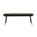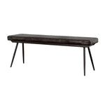 Blending rustic charm with industrial appeal, this dining bench is a bold yet versatile seating option. Upholstered in hand-dyed genuine goat leather, the padded seat with vertical tufting offers both comfort and durability. The sleek black metal base, featuring flared and tapered legs, provides a sturdy foundation with a modern edge. Designed to complement a variety of interiors, this bench is perfect for industrial, rustic, or contemporary dining spaces, offering both style and functionality.