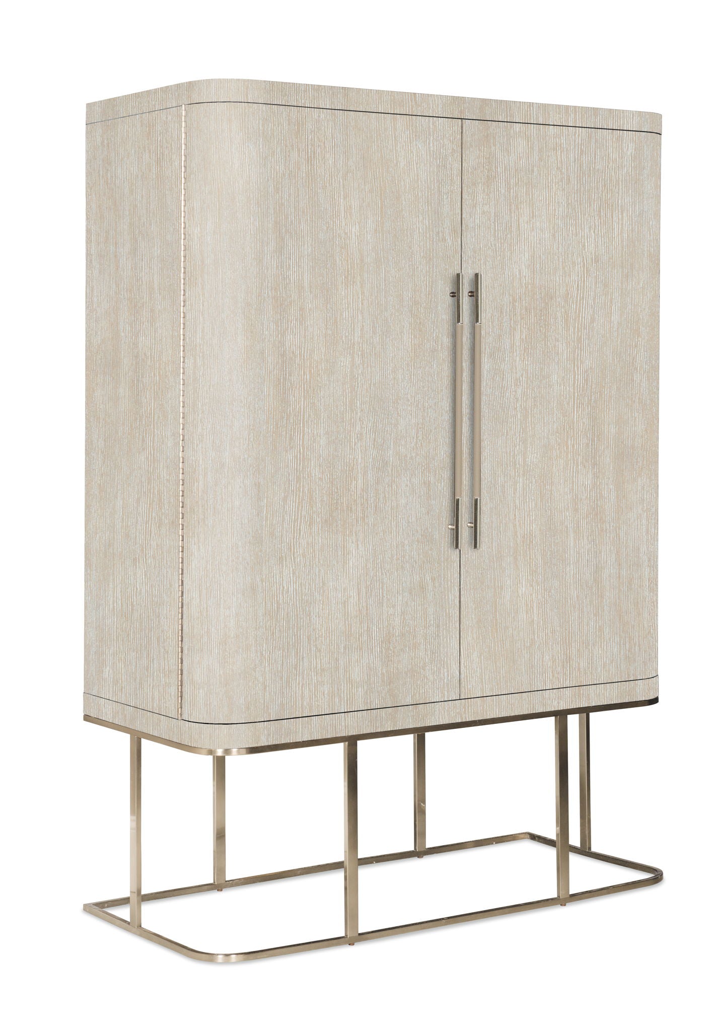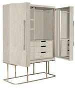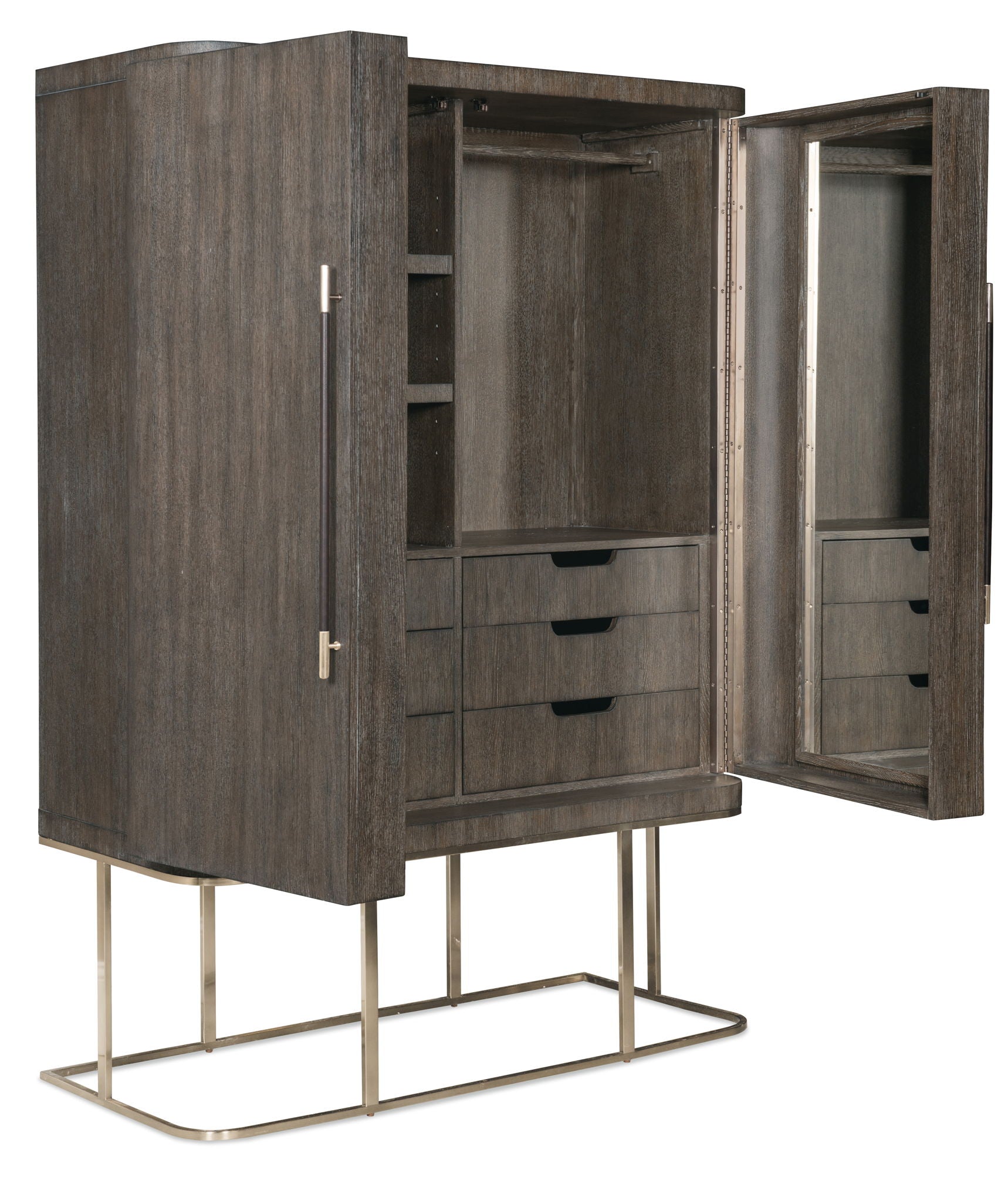 Unit price perArchitectural and timeless with a luxe mixture of materials, the Modern Mood Wardrobe is a statement piece. The shaped metal base gives the cabinet a floating appearance. Crafted with Oak Veneers, the wardrobe is finished in a serene Diamond color and has two large wood doors with piano hinges and mirror glass on the back of the right-side door. Behind the right-side doors are two adjustable shelves. Features include six self-closing drawers, a removable clothing rod and jewelry storage behind the left-side doors that includes 26 hooks, three felt-lined trays and one removable drop-in jewelry tray with four padded rows for rings.
